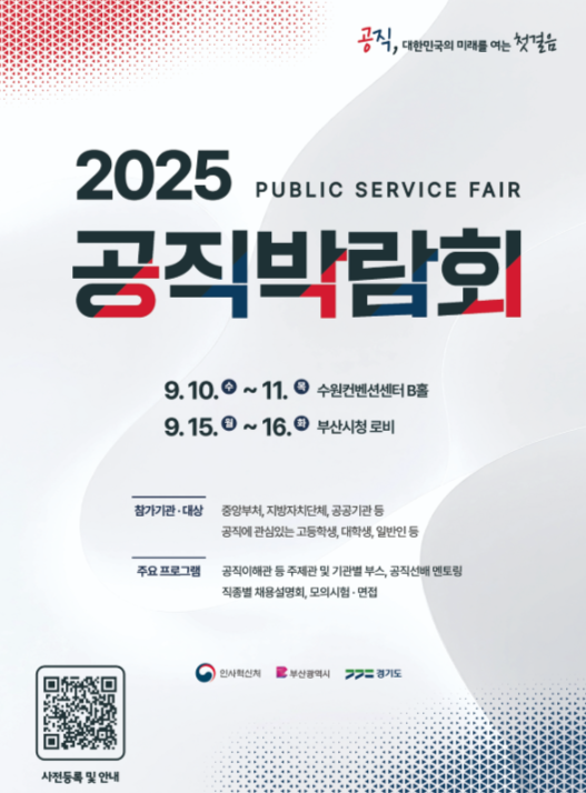 2025년 9월, 수원과 부산에서 열리는 공직박람회에서는 모의시험, 멘토링, 채용설명회 등 공직 준비생을 위한 다양한 프로그램이 진행돼요. 공직에 관심 있는 고등학생, 대학생, 일반인 모두 참여할 수 있으며 사전등록 시 QR코드만으로 간편 입장이 가능합니다.